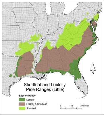 Natural ranges of shortleaf and loblolly pine based on maps developed by E.J. Little.